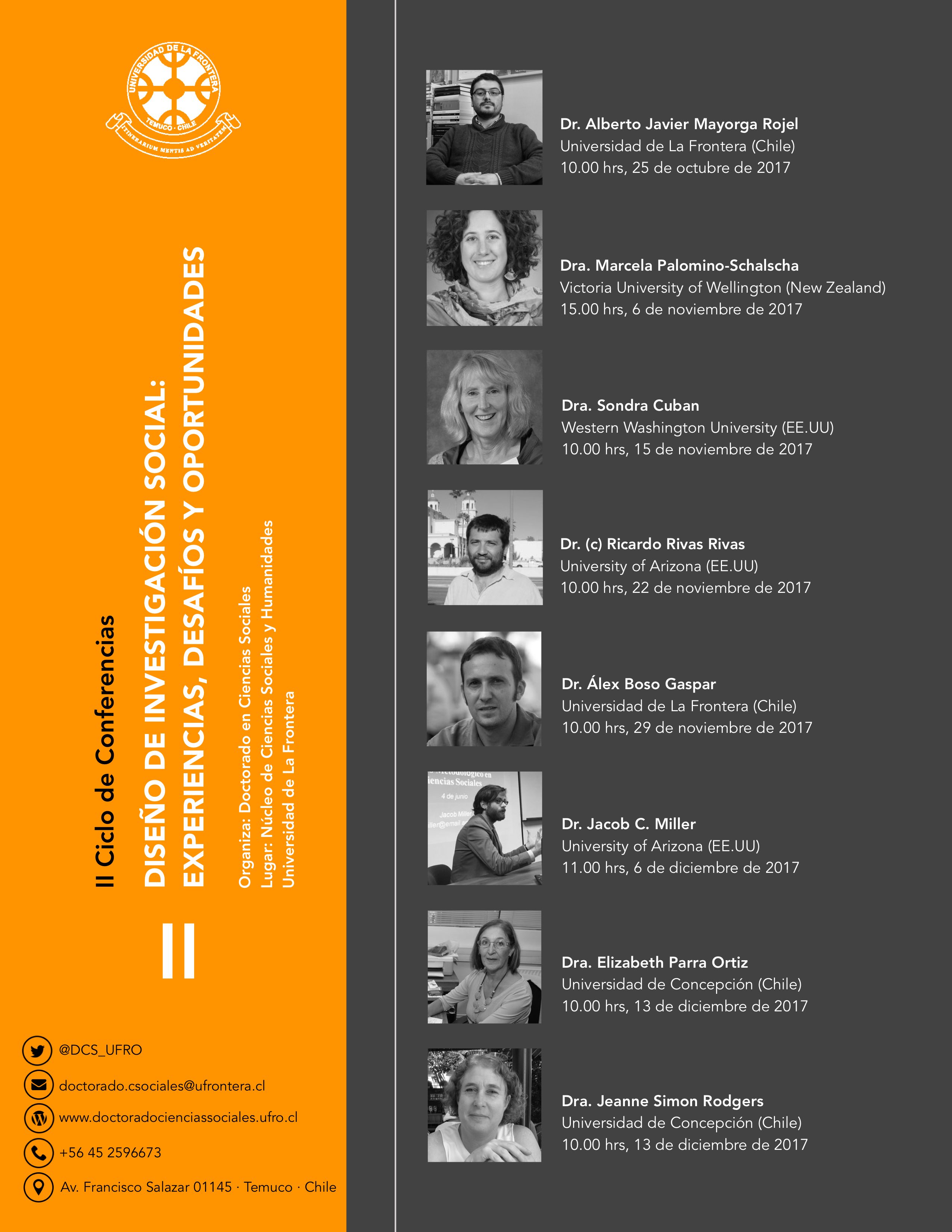 El Doctorado en Ciencias Sociales de la Universidad de La Frontera organiza el II Ciclo de Conferencias sobre “Diseño de Investigación Social: Experiencias, Desafíos y Oportunidades”. Esta actividad académica se llevará a cabo durante los meses de octubre, noviembre y diciembre de 2017, periodo de tiempo durante el cual un conjunto de académicos de universidades chilenas y extranjeras compartirán con los estudiantes del Doctorado en Ciencias Sociales sus reflexiones, estrategias y experiencias en torno a la planificación y desarrollo de investigación social.