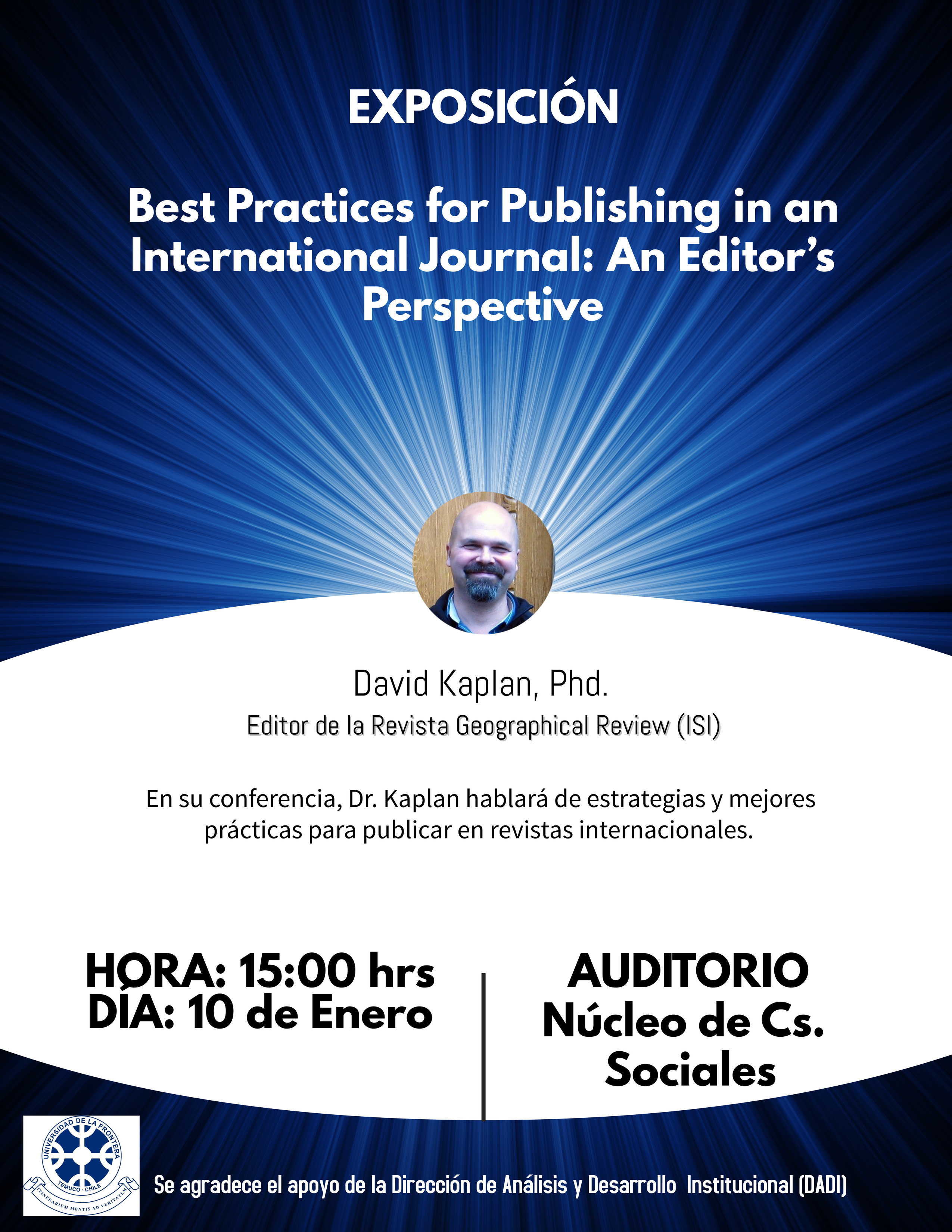 La Dirección de Análisis y Desarrollo Institucional, el Cie-Patagonia y el Núcleo de Ciencias Sociales y Humanidades, invitan a la comunidad universitaria a la presentación del Dr. David Kaplan, editor-in-chief de la revista ISI Geographical Review, “Best Practices for Publishing in an International Journal: An Editor’s Perspective”, que se realizará el 10 de Enero a las 15.00hrs en el Auditorio del Núcleo de Ciencias Sociales y Humanidades de la UFRO. Geographical Review, es la revista científica del American Geographical Society. Dr. Kaplan es profesor titular de Kent State University en Estados Unidos e investiga los temas de segregación urbana, identidad y etnicidad, y fronteras. https://www.kent.ed u/geography/profile/david-h-ka plan.