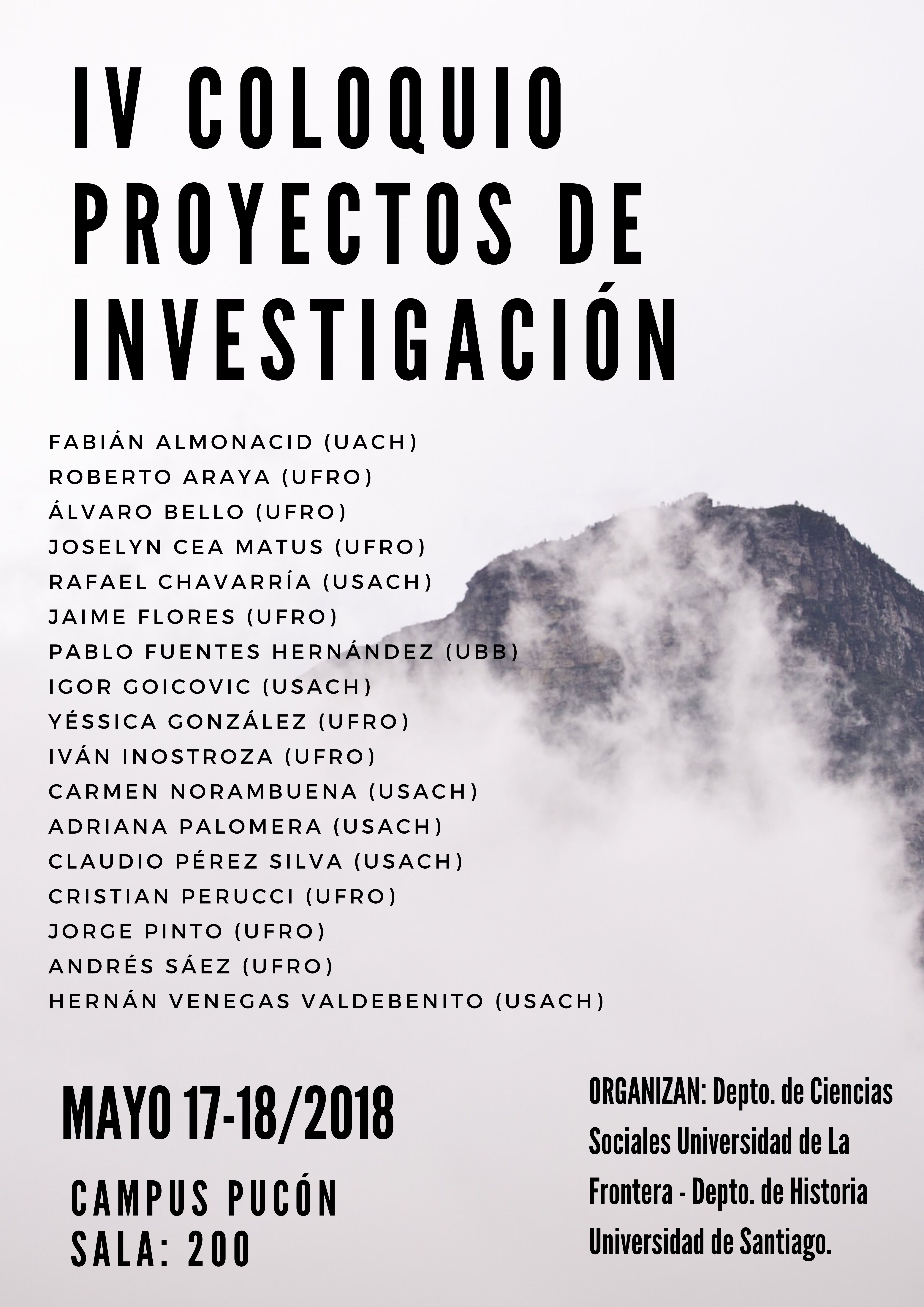 Académicos de la línea de investigación en Historia, Frontera y Estado-Nación del Doctorado en Ciencias Sociales participaron del IV Coloquio de Proyectos de Investigación en Historia, que se llevó a cabo en el Campus Pucón de la Universidad de La Frontera durante los días 17 y 18 de mayo de 2018. El encuentro académico organizado por el Departamento de Ciencias Sociales de la Universidad de La Frontera y el Departamento de Historia de la Universidad de Santiago, tuvo como objetivo reunir a un conjunto de académicos y académicas de varias universidades chilenas (Universidad de La Frontera, Universidad De Santiago, Universidad Austral de Chile y Universidad del Bío Bío) para presentar los proyectos de investigación que se están desarrollando, compartir los resultados de los trabajos y dialogar en torno a las nuevas propuestas de investigación que se pueden elaborar entre los investigadores de las universidades participantes del encuentro.