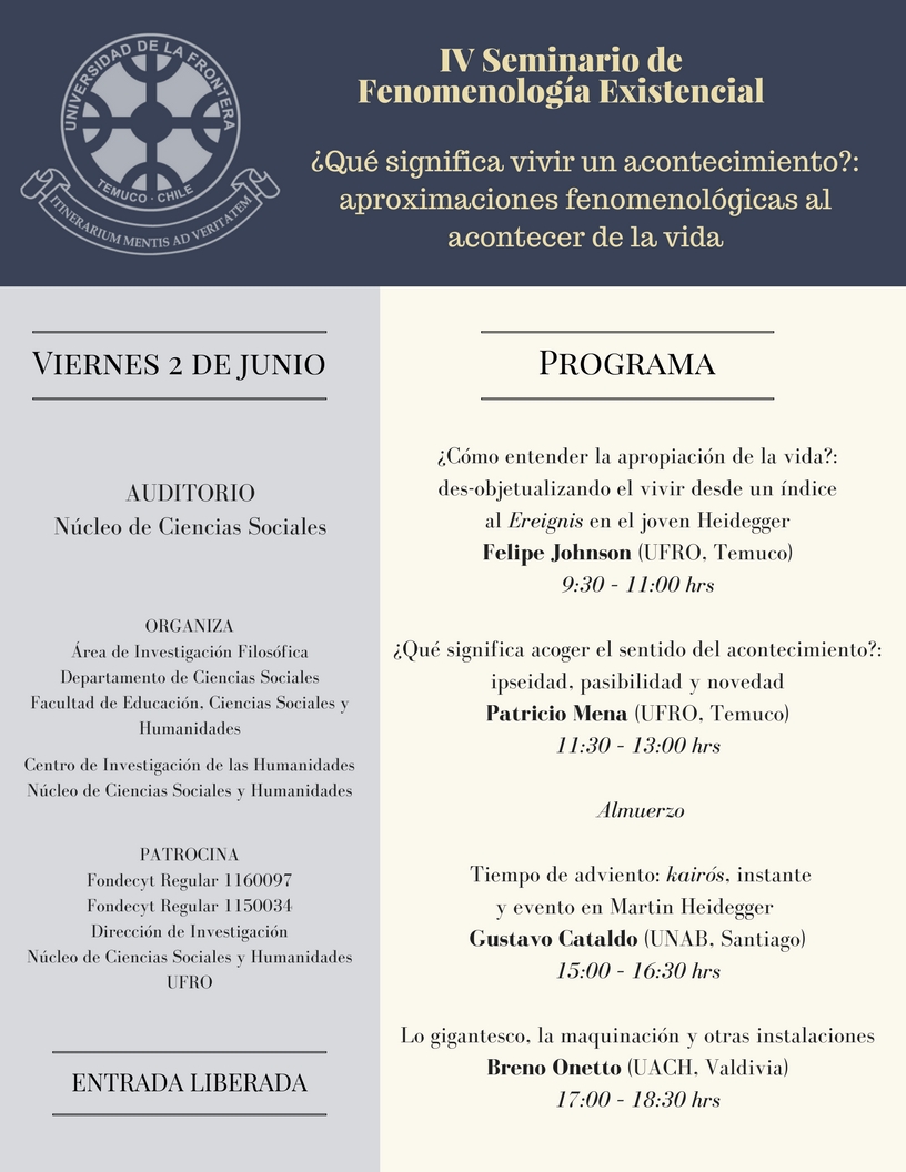 las Humanidades (CIH) de la Universidad de La Frontera, organizaron el IV Seminario de Fenomenología Existencial: ¿Qué significa vivir un acontecimiento?: aproximaciones fenomenológicas al acontecer de la vida.